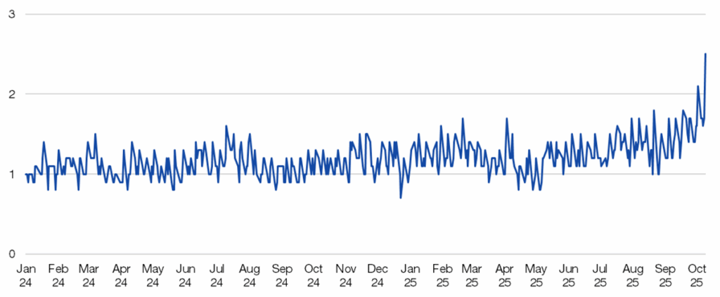 当前 mNAV 1.27x(低于 2.5x),所以 MSTR 可能仅用于债务/股息支付,而非大举买 BTC。这解释了第三季度买入放缓(仅 22 亿美元)的原因。
