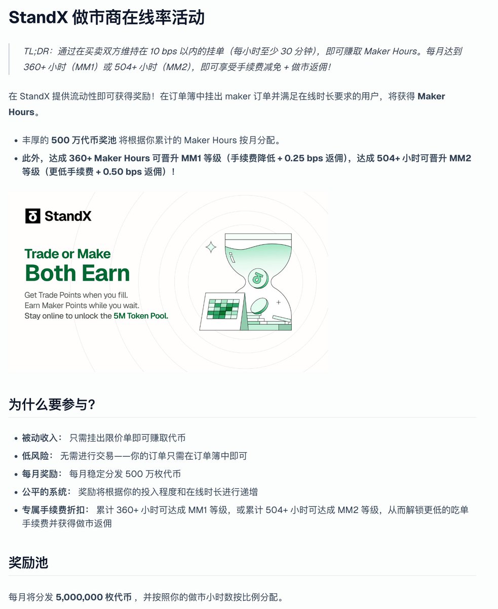 现在的Perpdex一个一个越来越卷了,现在不仅仅是刷交易量了,@StandX_Official 新出的 maker points机制,连挂单也有积分了,而且每个月还有500 万枚代币的奖励。