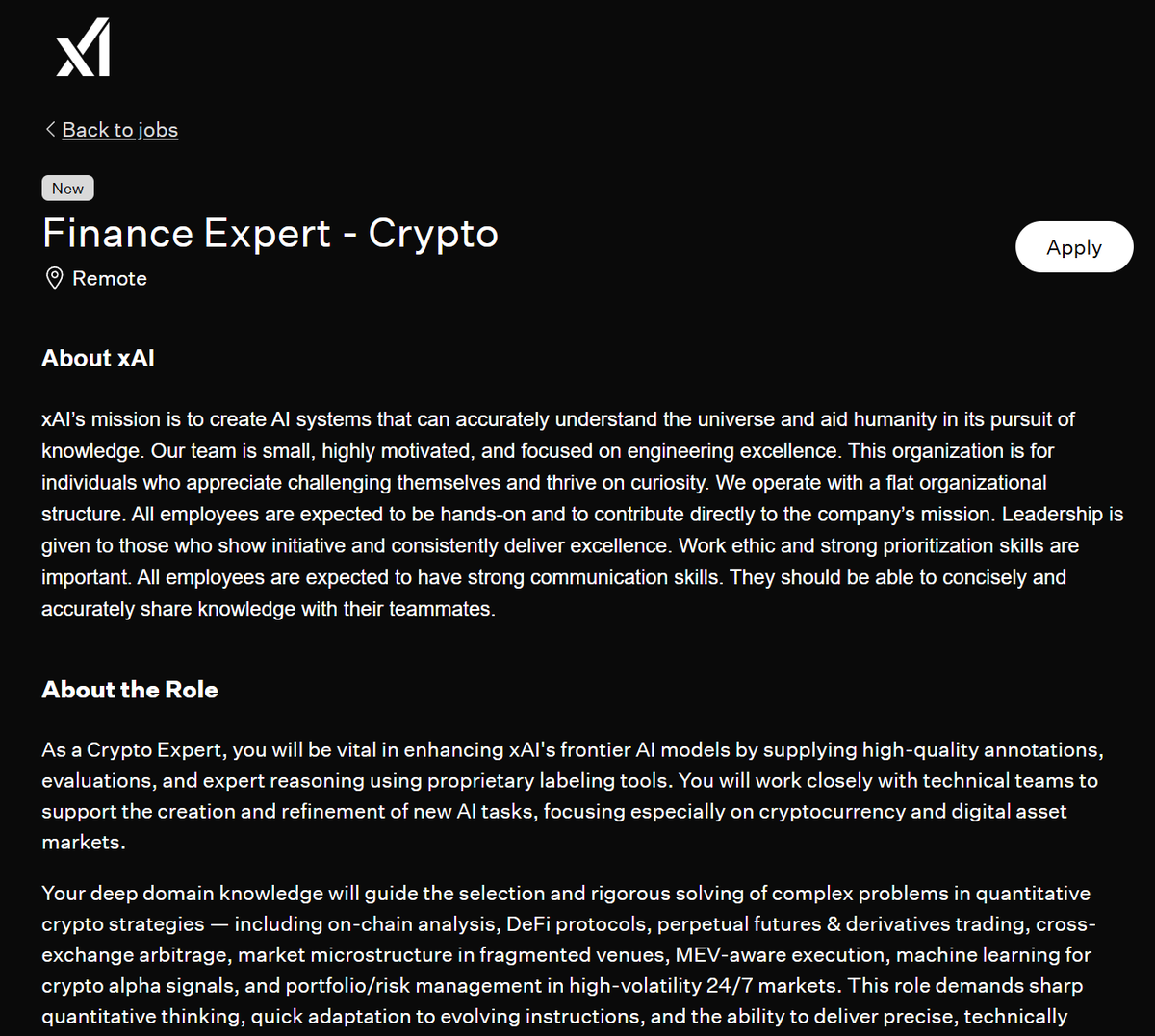 马斯克旗下人工智能公司 xAI 正在招聘加密金融专家,负责为 xAI 的前沿人工智能模型提供高质量的标注、评估和专家推理,重点关注加密货币和数字资产市场。