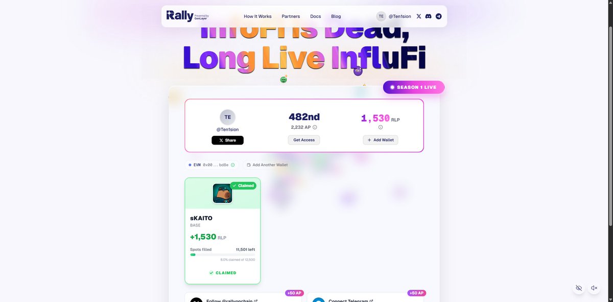 可以白嫖一波 @RallyOnChain 的 RLP 積分了,平臺會根據你在這三個平臺的使用情況直接發分