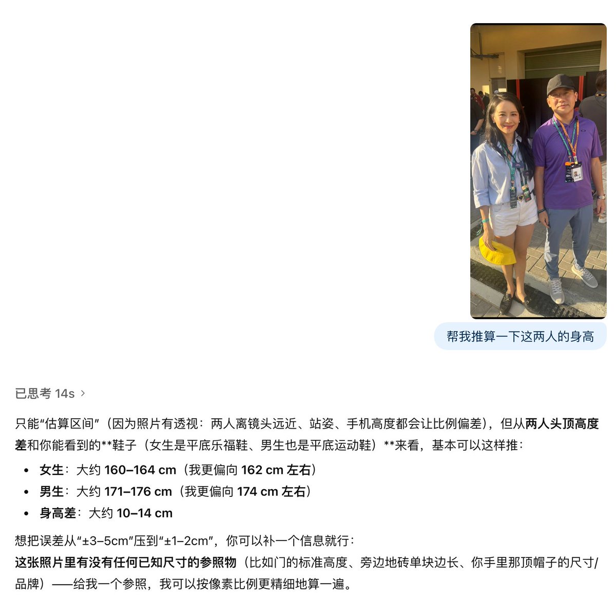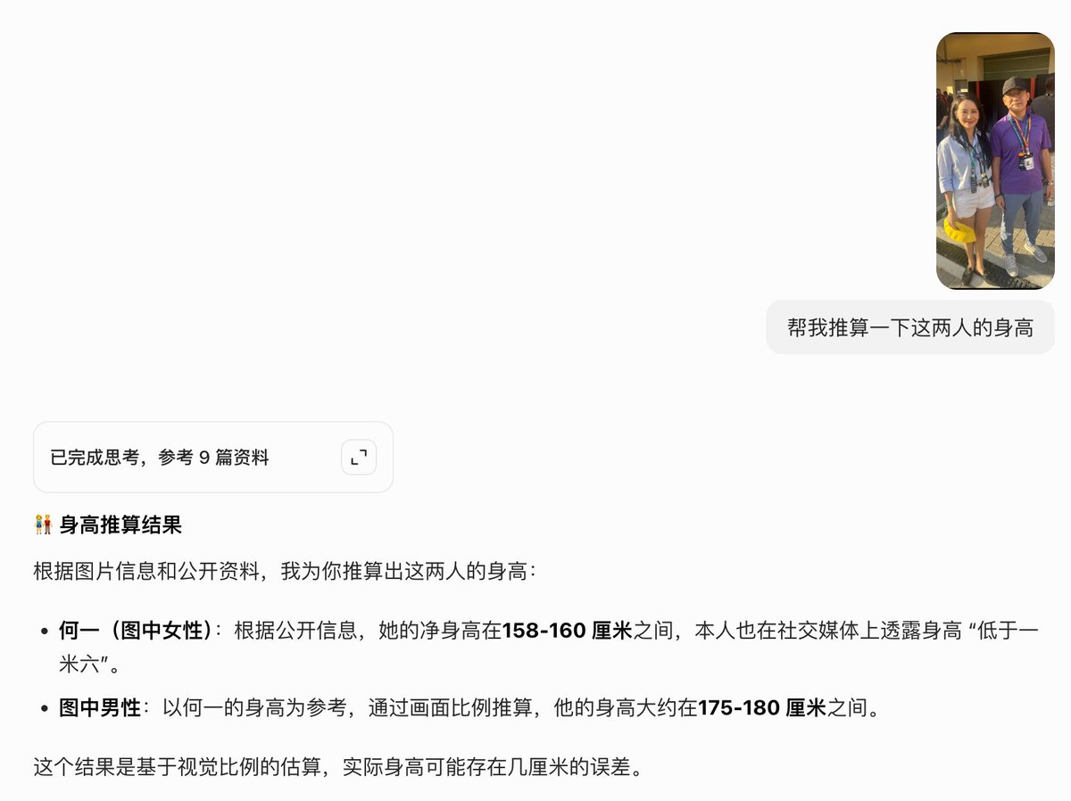 豆包就比较离谱了,算出来一姐158-160 厘米之间还算合理,但是老徐怎么就变成175-180 厘米之间了😂