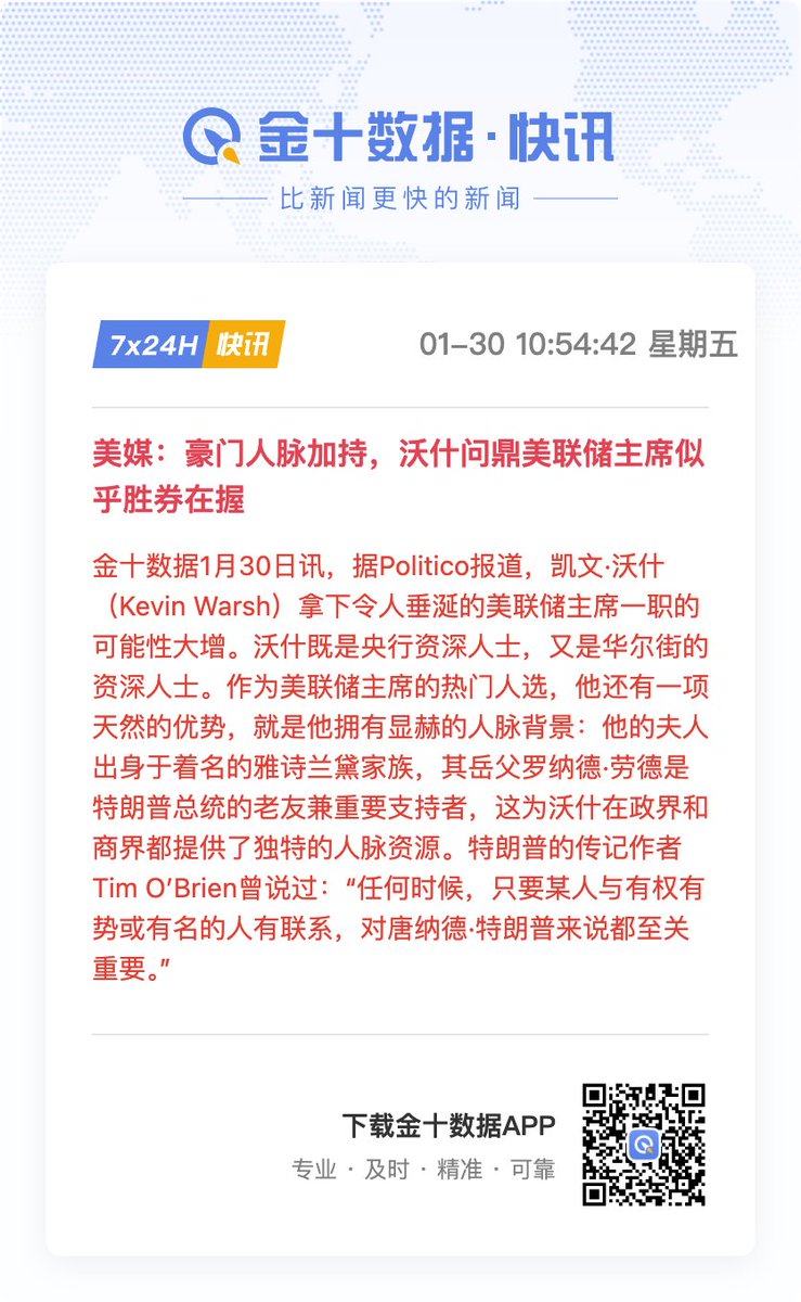 而关于沃什可能获得美联储提名的预期,恰好在市场最敏感的时点,提供了一个绝佳的 “再定价”题材。这并非因为沃什的个人能力,而是他长期以来所代表的政策倾向——更倾向于基于规则、对通胀更为警惕、可能容忍更高利率——恰好成为了市场情绪切换的完美催化剂。