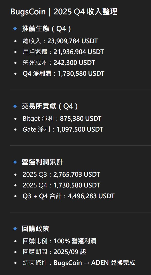 刚看完 Bugscoin 基金会 Q4 业绩报告,数据相当硬核!实打实的回购回馈,这种真金白银做事的态度,在现在的圈子里真的难得。@bugscoin_bgsc