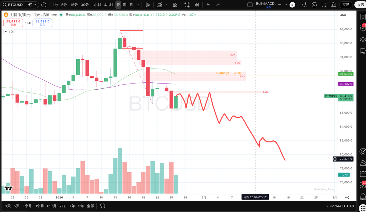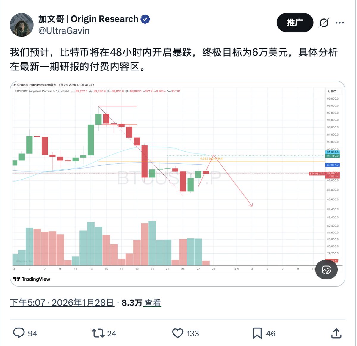 1月28日精准预警:比特币 48 小时内开启暴跌,目标 6 万。