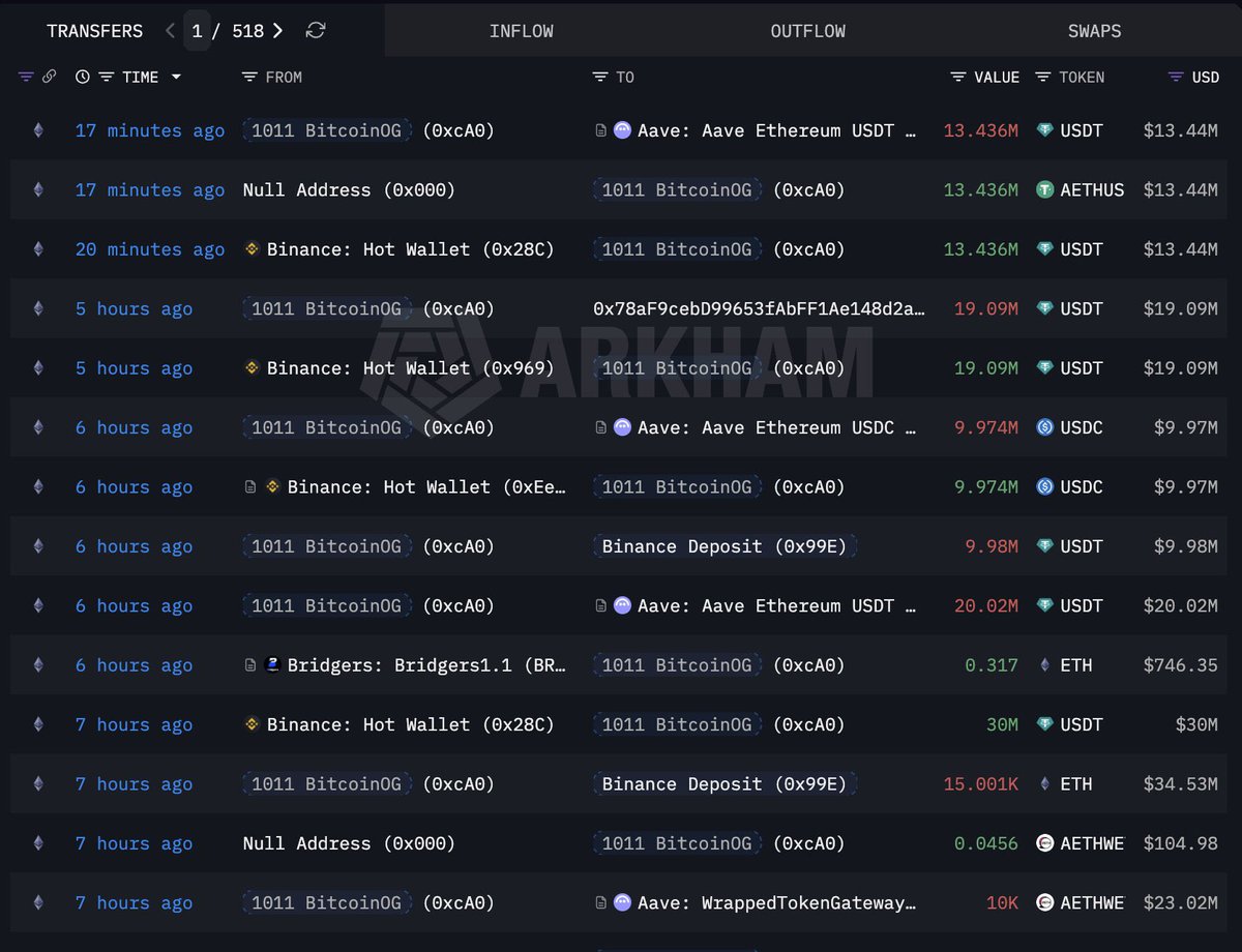 这位 #BitcoinOG(1011short)过去两天向 #Binance 存入了 121,185 枚 $ETH (约 2.92 亿美元),同时提取了 9,250 万美元的稳定币,用于偿还在 Aave 上的贷款。