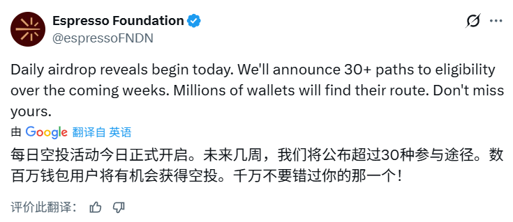 9、Espresso @EspressoSys 60万枚代币给嘴撸活动,11月31号结束