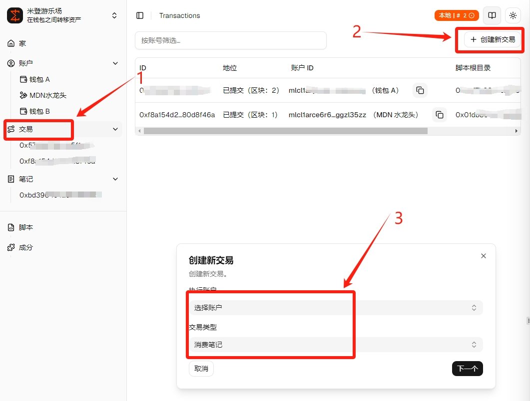 3、右上角连接miden钱包,左侧点击交易 接着选择创建新交易,账户选择A,类型选择send 接收账户选择B,代币MDN,输入数量发送即可