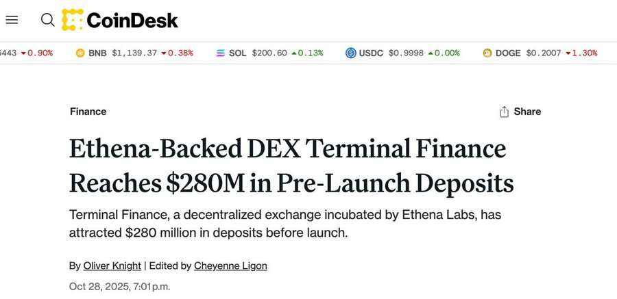 Terminal @Terminal_fi 是由 Ethena Labs @ethena_labs 孵化的现货 DEX,TVL达到了2.8亿美金,围绕稳定币 USDe / sUSDe 搭建流动性生态,同时支持机构进入的合规机制,并在机制上做了链上收益再分配的闭环设计。简单来讲就是交易的同时还能持续吃利息,流动性池越活跃收益越高,有飞轮机制,脱离了简单的DEX概念,架构了一个格局巨大的TradFi基础设施入口