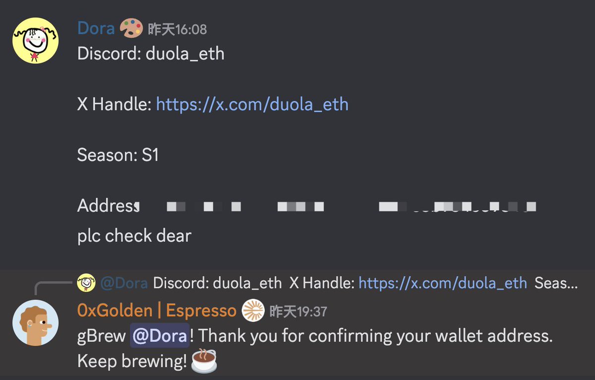 兄弟们,如果在 Espresso @espressosys 的dc有 caff-creator 角色的,去开票然后提交 dc名字 / 推特名字 / 参与的赛季 S1 还有钱包地址