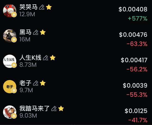 中文Bsc是主场,$币安人生 上了币安现货, $哈基米 $恶俗企鹅 $客服小何 $修仙 $我踏马来了 也受到币安认可,这几天还有一些表现不错的比如: $老子 $人生K线 $草根文化 等