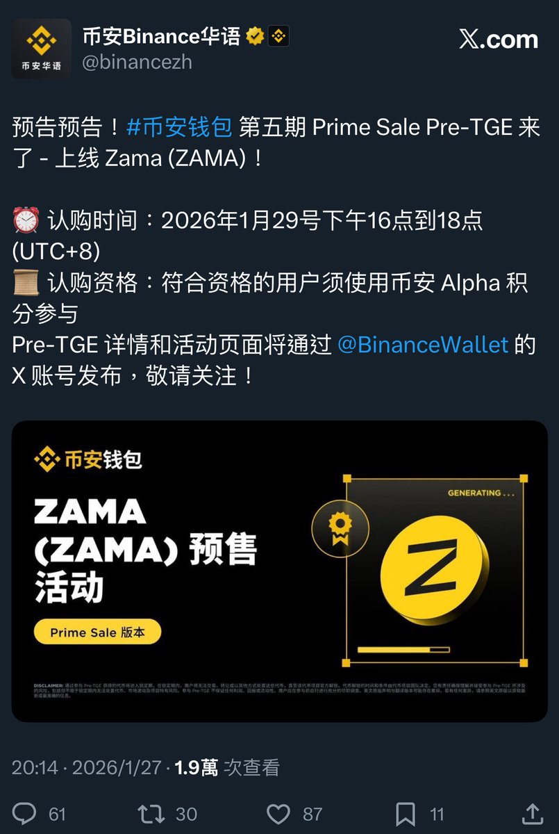 4,实际的 ZAMA 将在 TGE 日期(2月2日)空投到币安 Alpha 帐户