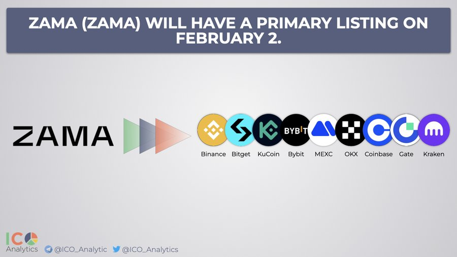 ✅ZAMA @zama 将于2月2日正式上线。币安、OKX、Bybit、Bitget、KuCoin、Coinbase、MEXC、Kraken和Gate等交易所将于前后开通ZAMA的交易。 ZAMA近期透过公开拍卖筹集了4,400万美元,最终发行价为5.5亿美元。