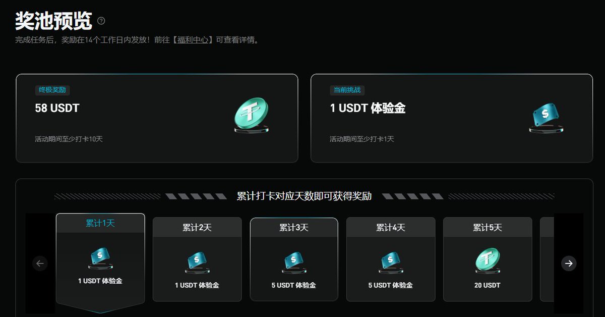 活动期间,用户每日完成指定的合约交易量任务,即可领取该日奖励。