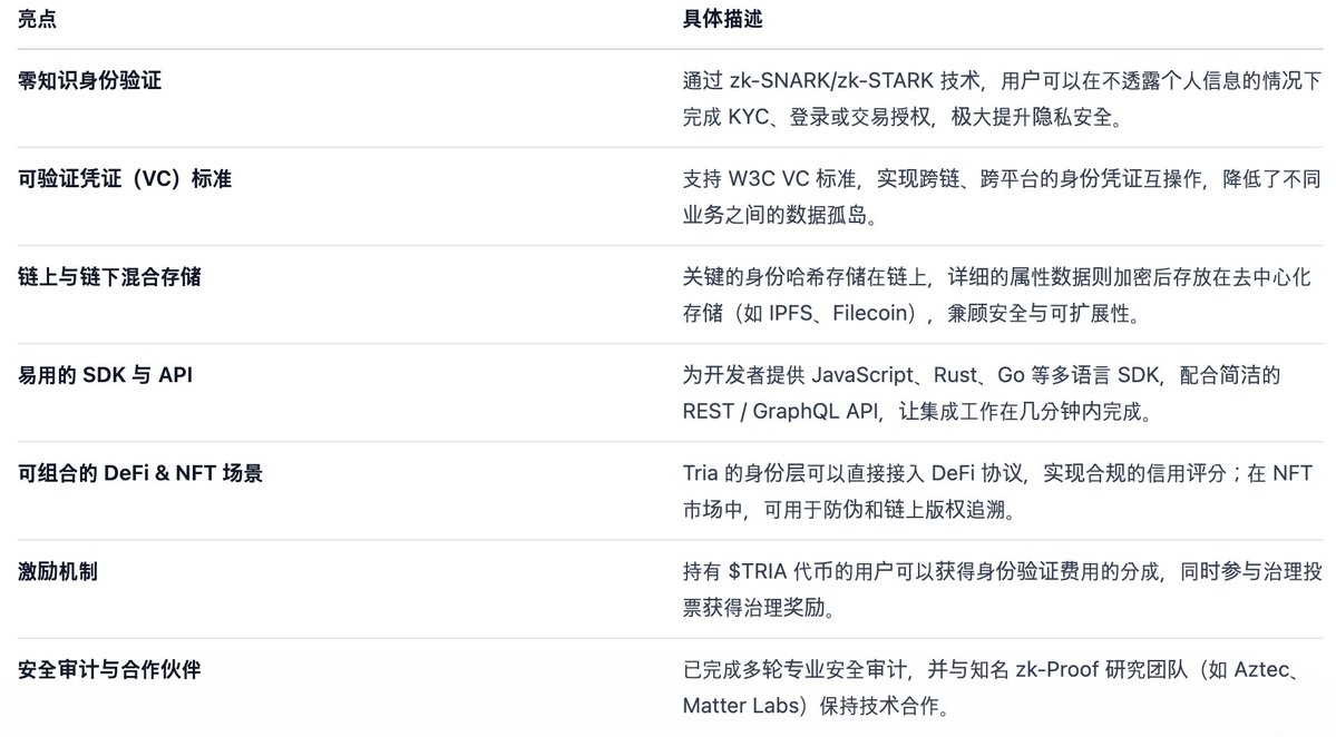 Tria 通过 零知识身份验证 + 可验证凭证 的组合,为区块链世界提供了一套兼顾 隐私、合规与可组合性 的身份解决方案。若项目能够进一步降低使用成本、提升跨链体验,并持续激励生态建设,Tria 有望在去中心化身份领域占据重要位置。