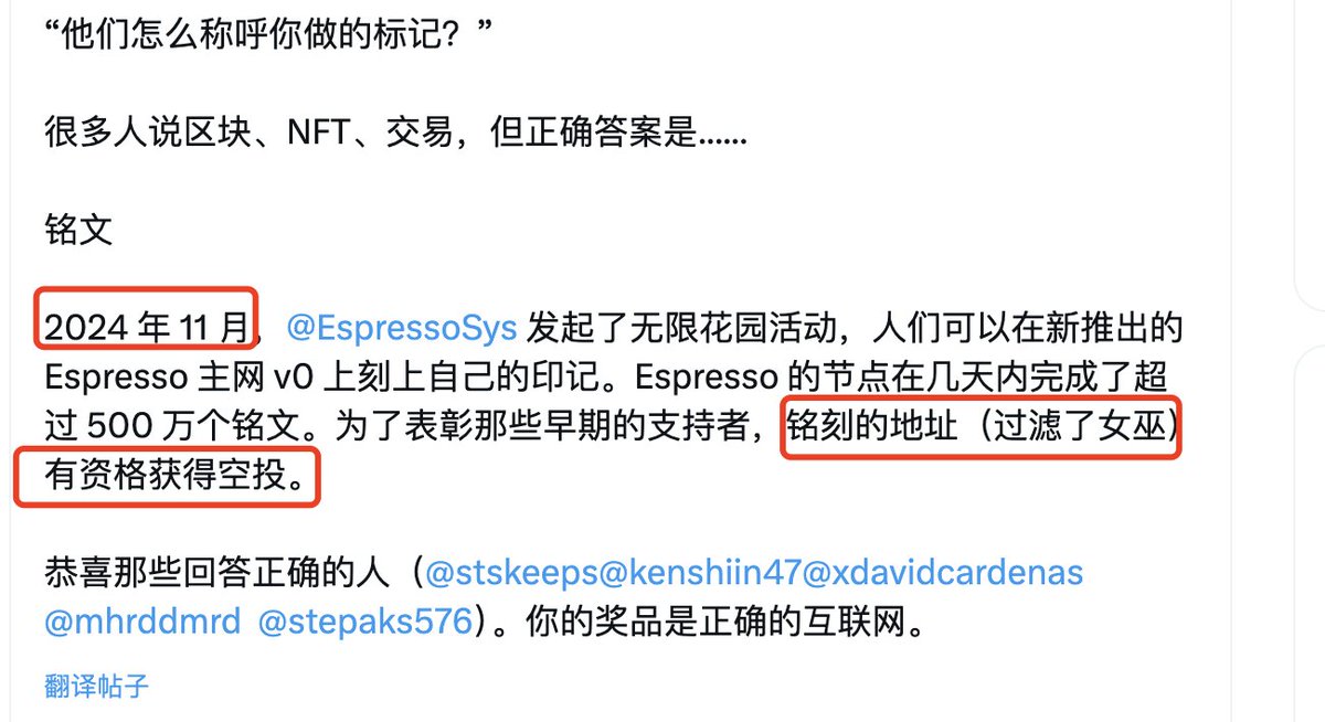 远古项目 @EspressoSys Tge又有了点进展了,未来30多天里,每日空投揭晓一个空投资格的途径。第一天是铭刻的地址有资格!!!