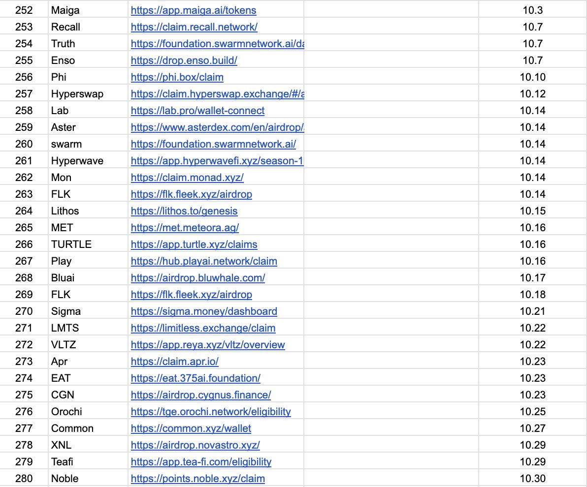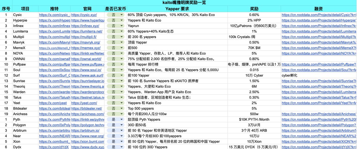 7、其他已发币的: @OrderlyNetwork @arbitrum @NEARProtocol @Aptos @Pyth @Polygon @burnt_xion @Injective_Hub @Mantle_Official @GOATRollup @Surf_Copilot @PortaltoBitcoin 虽然已经发币,但是 基本每个月或季都会发空投,而且相对不是那么卷。非常适合大众
