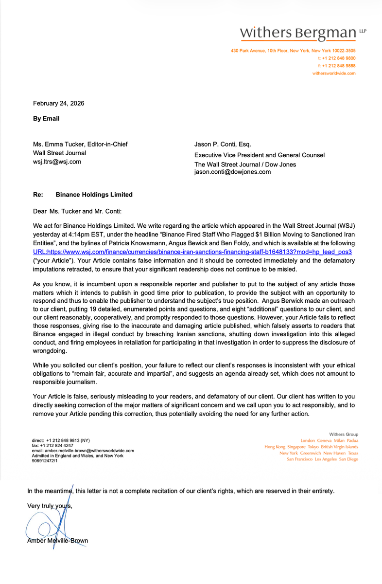 The Wall Street Journal published defamatory claims, and despite our efforts to set the record straight, the journalist failed to acknowledge any of our corrections on the allegations. We have sent the attached letter demanding immediate corrections and a full retraction of these false statements.