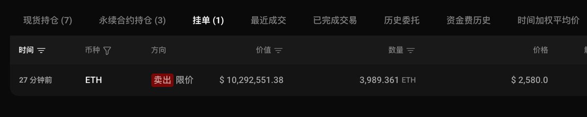 「1011 闪崩后开空内幕大佬」平仓 24639.69 $ETH 后,仍有 3,989.36 ETH 的限价卖单仍未成交,价值 1029.2 万美元,卖出价格 $2,580,即如果 ETH 反弹他的多单将再次减仓