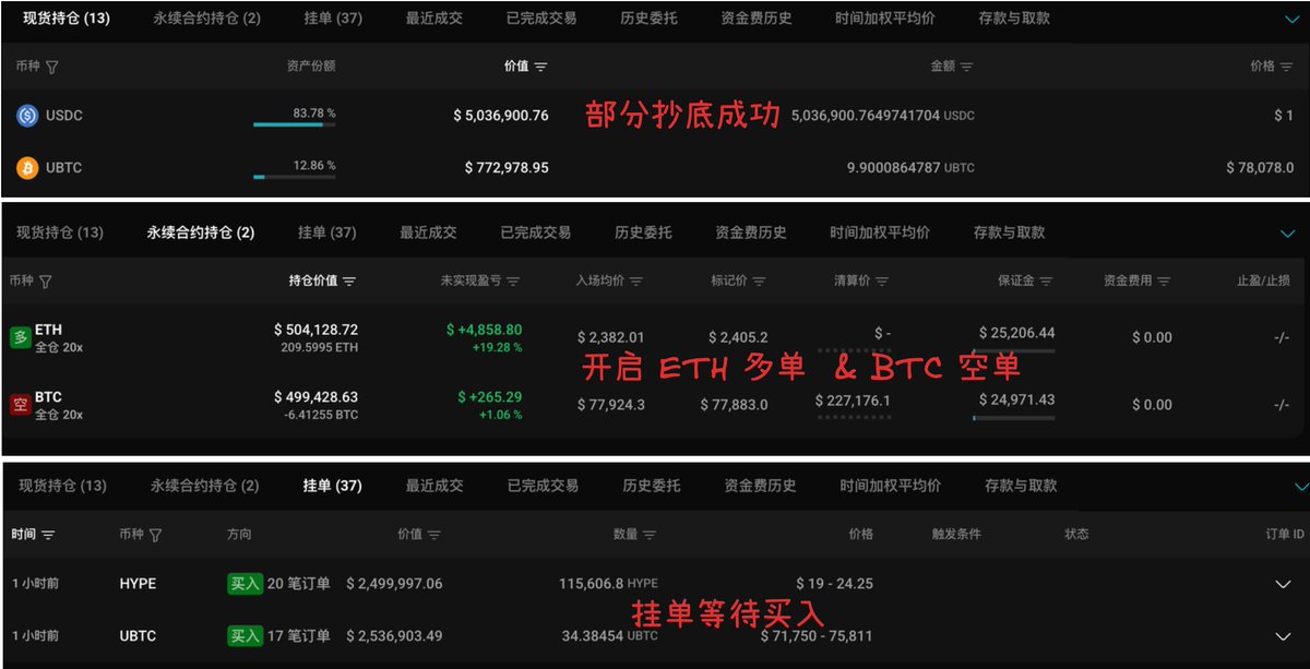 昨晚下跌时挂单「抄大底」的地址 0xd90…2D975 真的有 9.9 $BTC 成交了(76.3 万美元),平均买入价格 $77060.36;他还同步开启了 50 万美元的 $ETH 多单和 50 万美元的 BTC 空单
