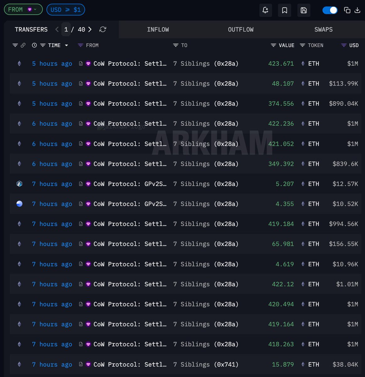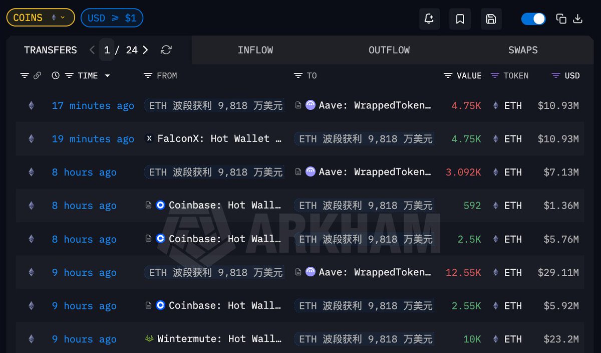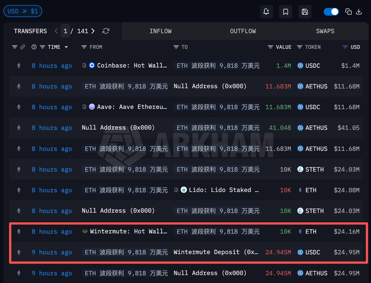 9 小时前(内幕巨鲸被清算前)该地址又向 Wintermute 充值 2494 万枚 USDC,随后收到 1 万枚 $ETH ,疑似 OTC 买入,成本 $2416.21;近两天该巨鲸 / 机构累计囤积 30000 枚 ETH(8056 万美元),平均成本约 $2685.35