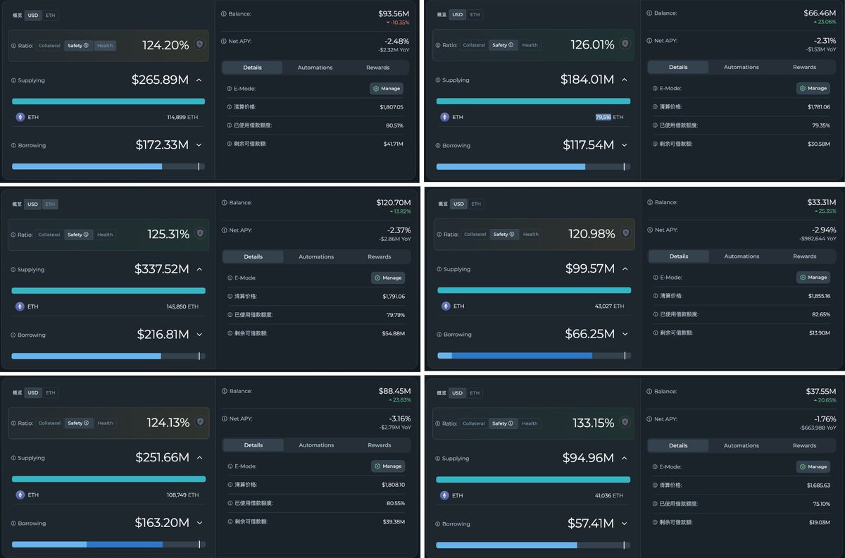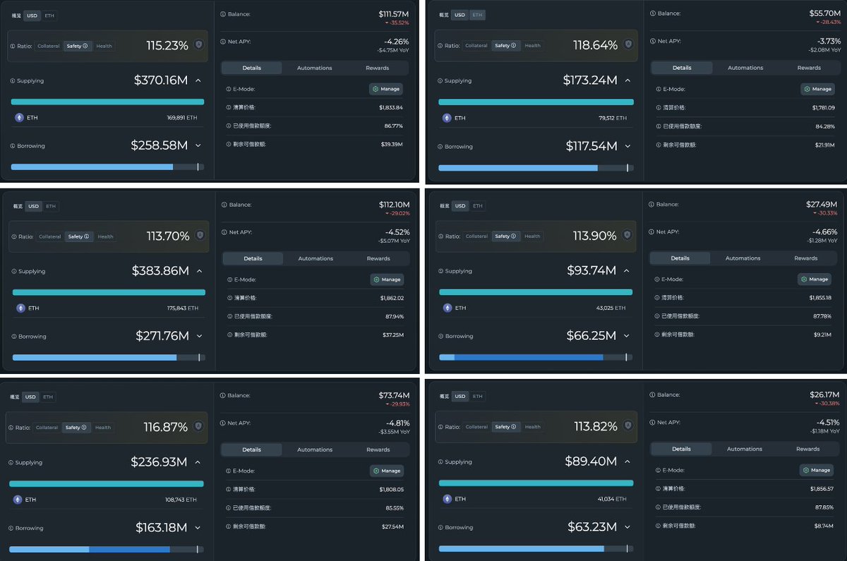 Trend Research 当前持有的 618245.96 枚 $ETH 主要分布在六个地址中,共抵押 13.3 亿美元的 WETH 借出价值 9.39 亿美元的稳定币,接下来是每个地址的清算价拆解