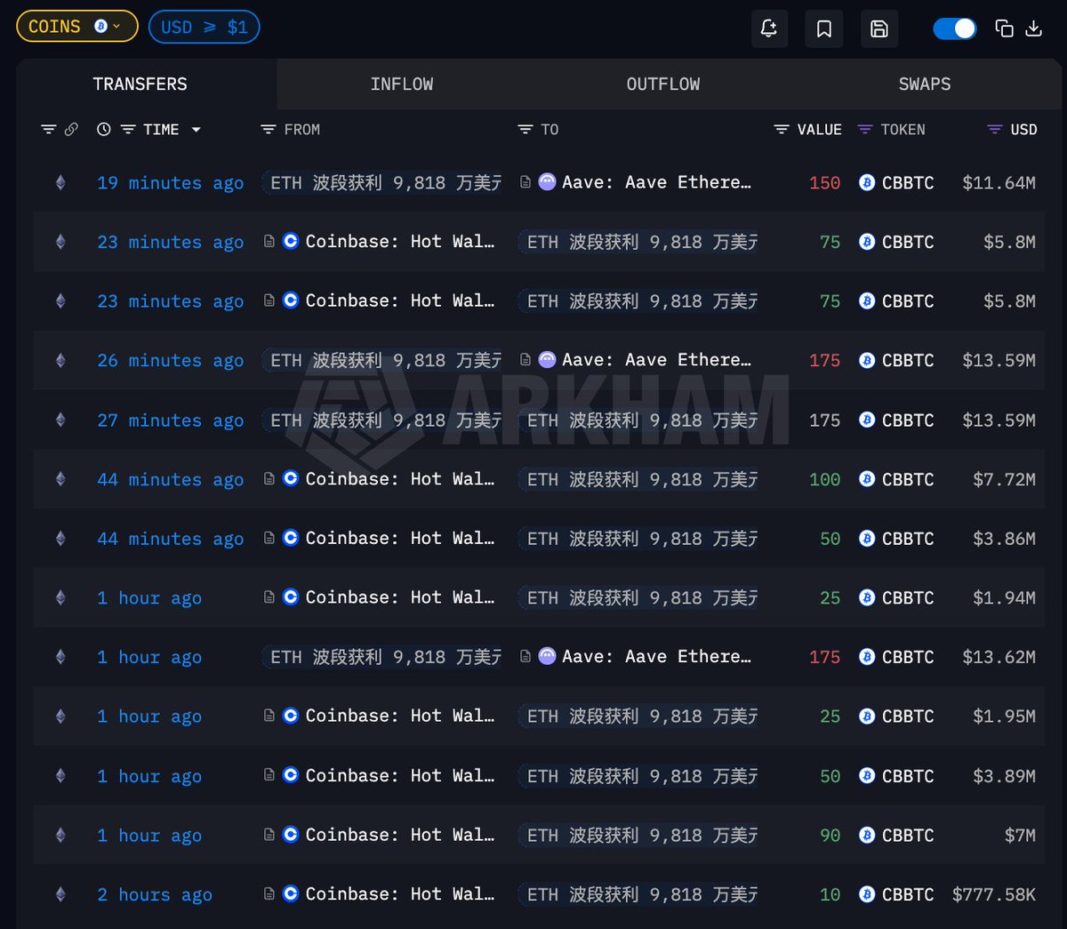 「ETH 波段获利 9922 万美元的聪明钱」过去 8 小时从 #Coinbase 提出 750 枚 $cbBTC ,总价值 5599.9 万美元,平均提出价格 $74665.8