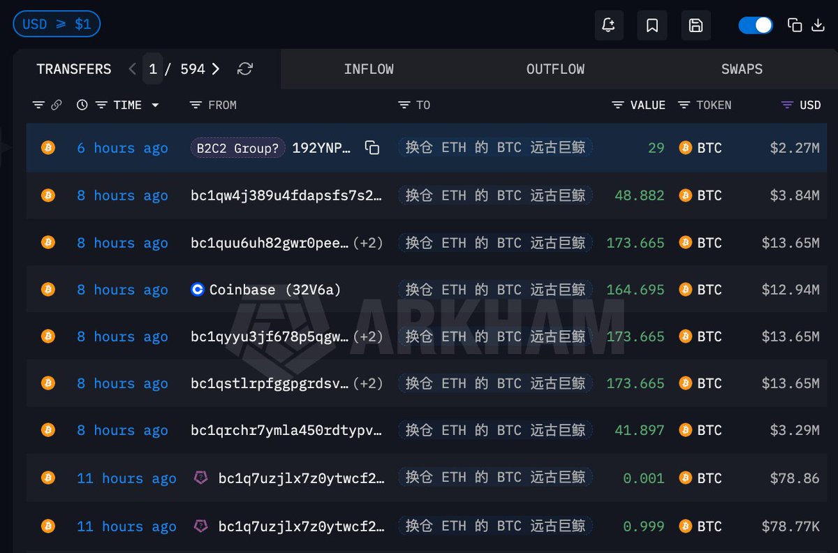 「爆仓 2.3 亿美元的 1011 巨鲸」过去 11 小时从 B2C2 和 Coinbase 处收到 806.47 枚 BTC,价值 6336 万美元🧐