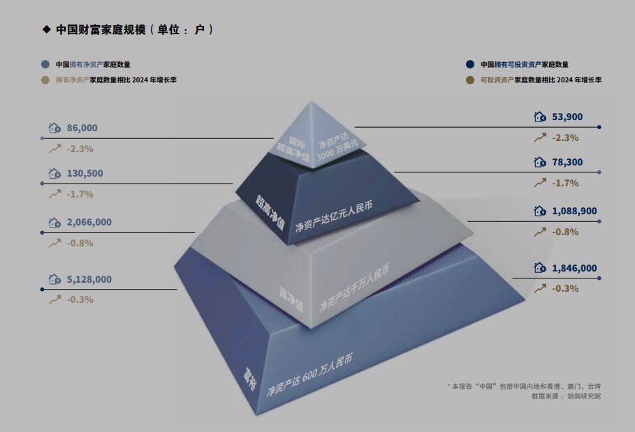 下图来源于胡润发布的《2025中国高净值人群金融投资需求与趋势白皮书》,数据显示全中国600万净资产家庭500万户,千万净资产家庭200万户,过亿净资产家庭不过13万户。
