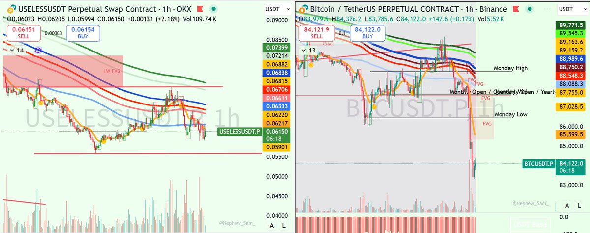 比特币仍然在89-90区间进行震荡。美盘日内出现了4H SFP意味着上方压力仍然较大,因此尽管我之前倾向于反弹93-94区间,客观上由于SFP出现,下行风险在进一步增加