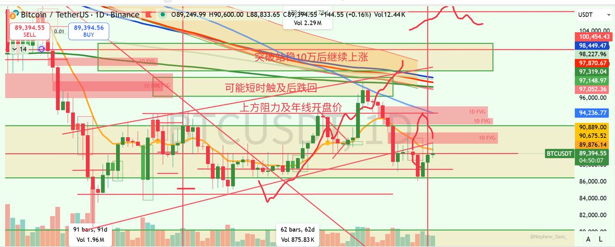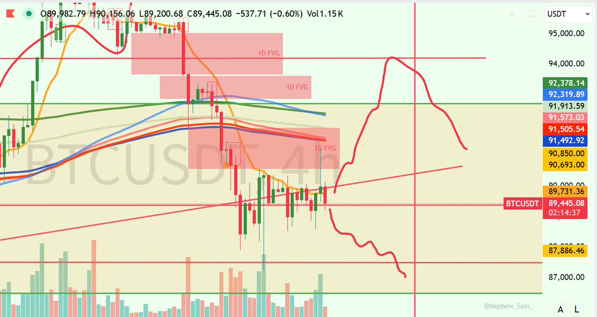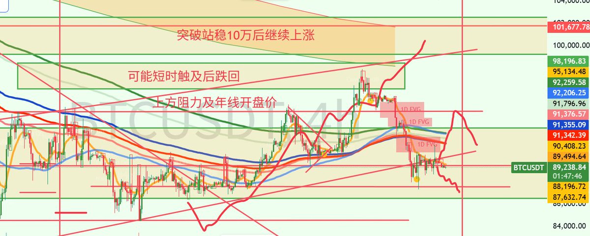 行情运行至上方阻力位89500区间。我在群中提出89500会是第一阻力,如果受阻的话会使比特币去到更低价格。若在此处突破,即有效站稳9万,那么将有机会去测试上方93-94区间