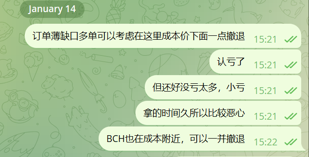 我的订单薄缺口多单(112以下DCA至84左右,均价在98)也在1月14号的顶部,97附近走了,因此目前处于没有什么多单的状态(在群里有所分享)。在97附近我也有在公开TG频道说自己止盈。如果下周开启主跌,希望家人们都成功避开。如果不开启,那肯定对于行业更好