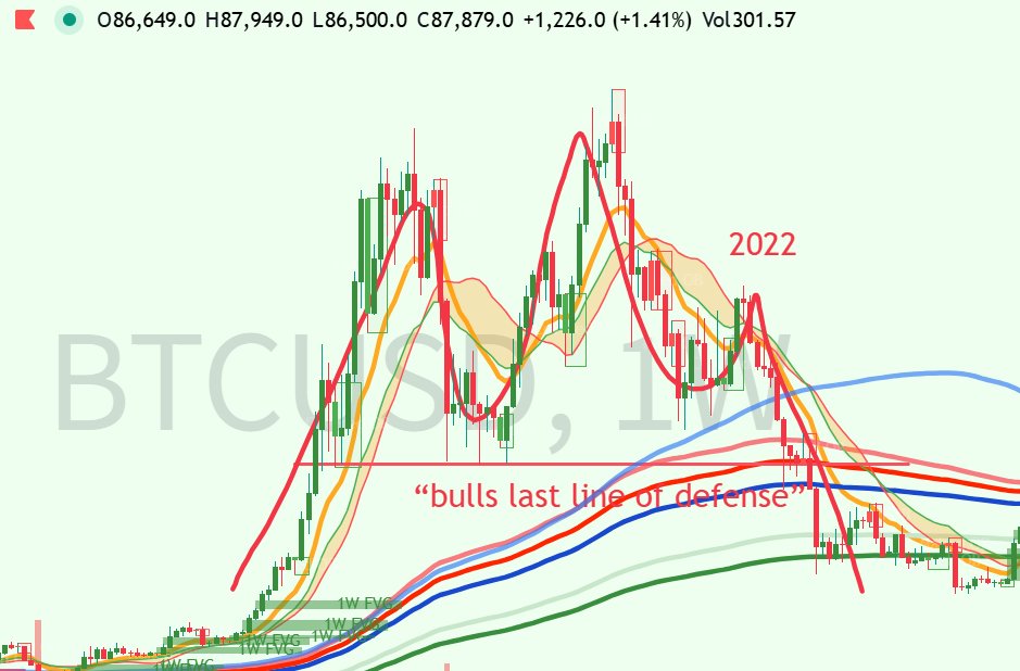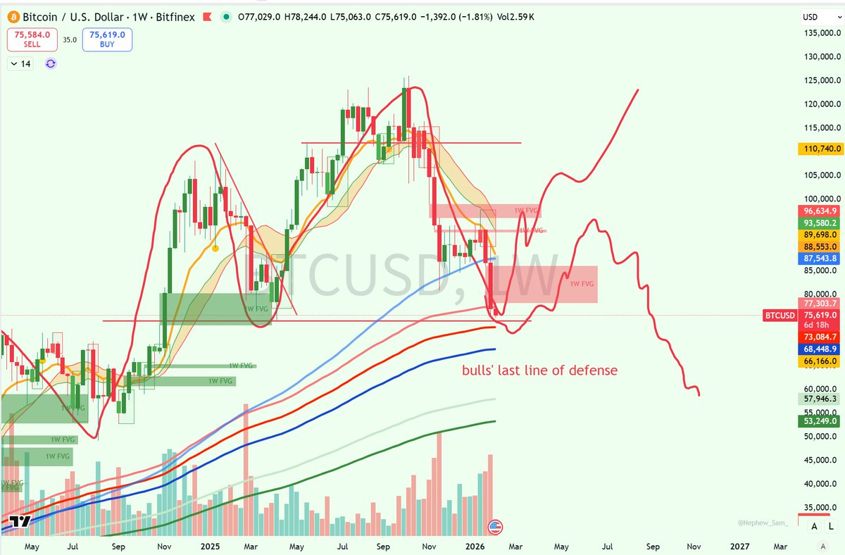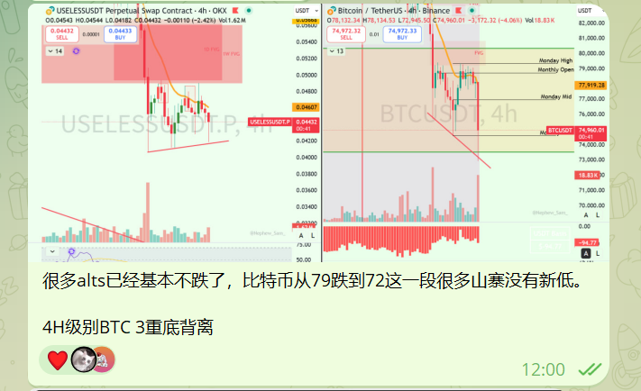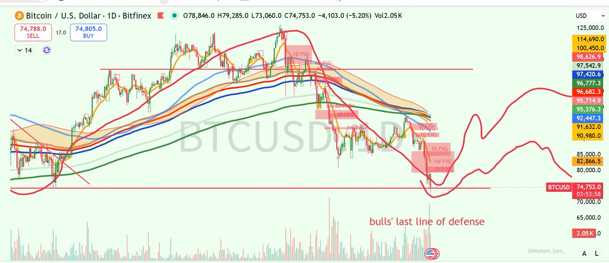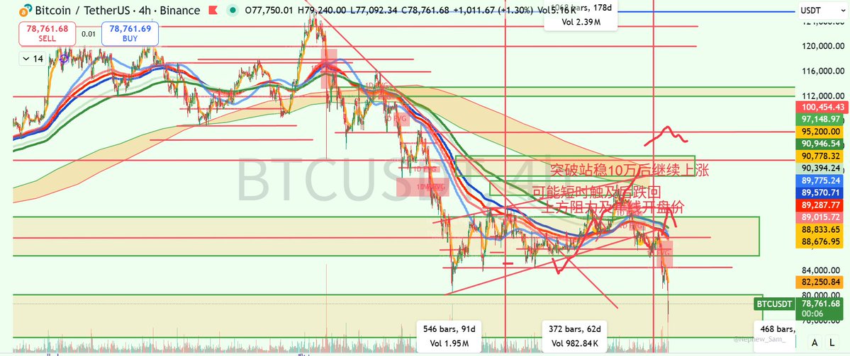 若跌破,下方支撑在73777以上,即2025年4月7号底部的再次测试,从而彻底证伪credibull astronomer等人的看涨最后依据