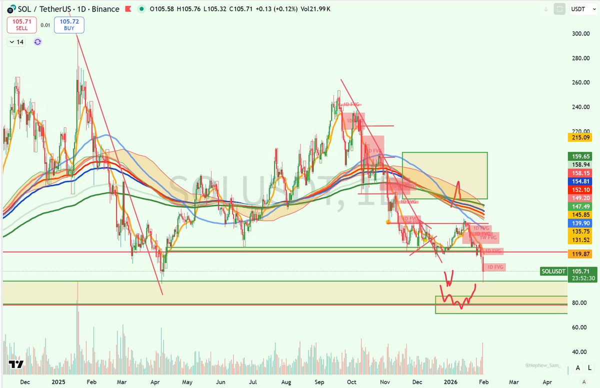 若BTC在本轮熊市最终跌破73777,预计SOL可能也会去到80以下。80以下的最重要支撑在50左右。(不确定一定能到)