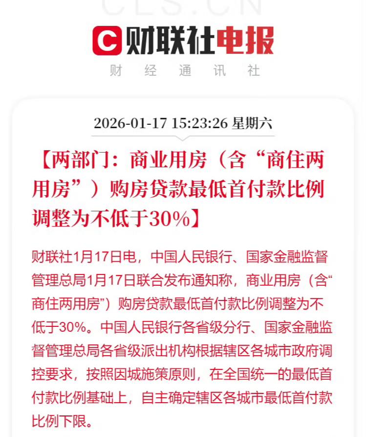 商业用房(包括商住两用)的首付比例,从原来的 50% 直接降到了 30%。
