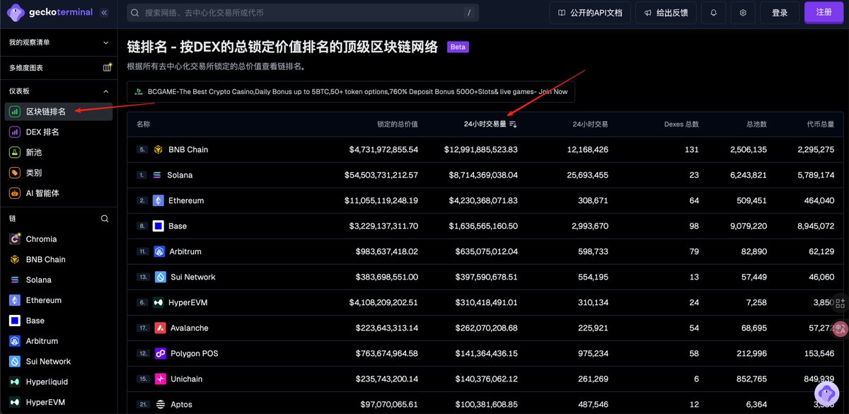 1️⃣打开 Chain Ranking 选择24H交易量排行