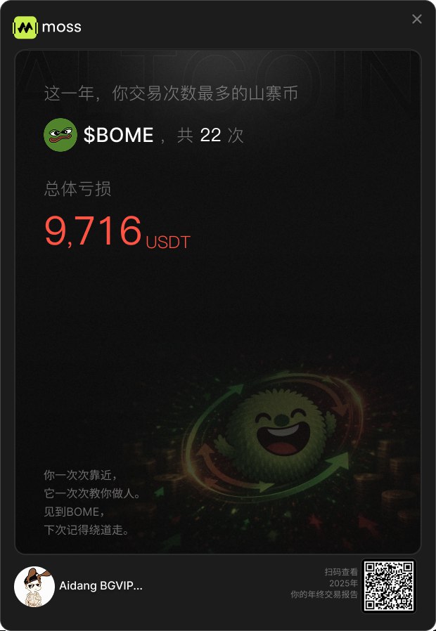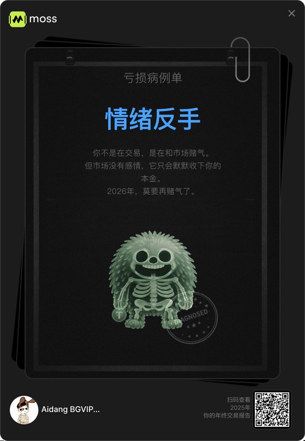 回顾一年来的心里历程,简直把我按在地上摩擦,饼子和大姨子涨上天,我重仓的山寨币却跌得快割到鸡鸡了,年初喊着百倍币自由,年底只剩裤兜空空😭 直到生成Moss @MossAI_Official的AI年度报告,被狠狠戳穿:原来我是“情绪反手”本手。