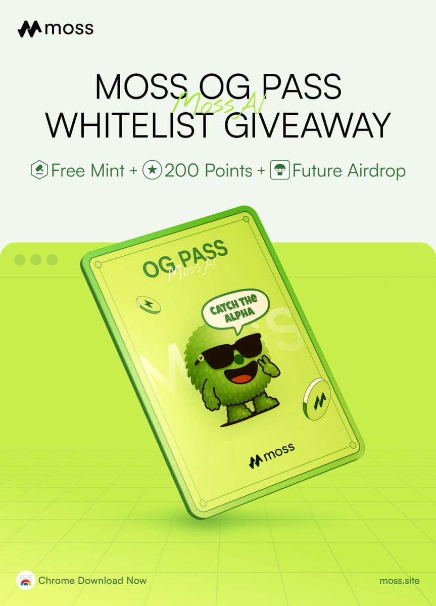 Moss 是一个AI驱动的Alpha聚合平台,本身就在帮用户过滤噪音、捕捉信号、节省时间。而这次OG Pass,更像是它在链上建立的第一层智能共识:你不是个旁观者,而是生态的一部分。Pass的价值其实不只是那200积分、空投资格、专属社群,而是你在AI × Crypto 这个新叙事中,有了一个可验证的身份凭证。