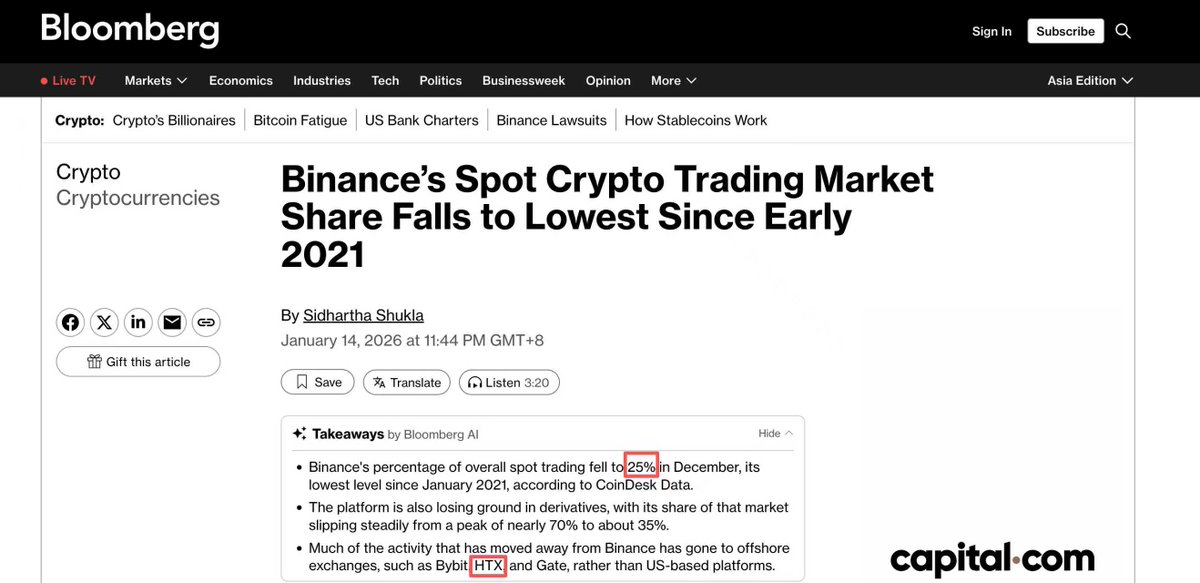 就刚刚正好刷到了 2025年12月CoinDesk数据,币安现货交易市场份额降至25%,是2021年1月以来的最低水平(那个时候火币、OK、币安并列三大),流出之后,目前HTX成为主要流入的交易所之一!只能说未来三大啥毛病!