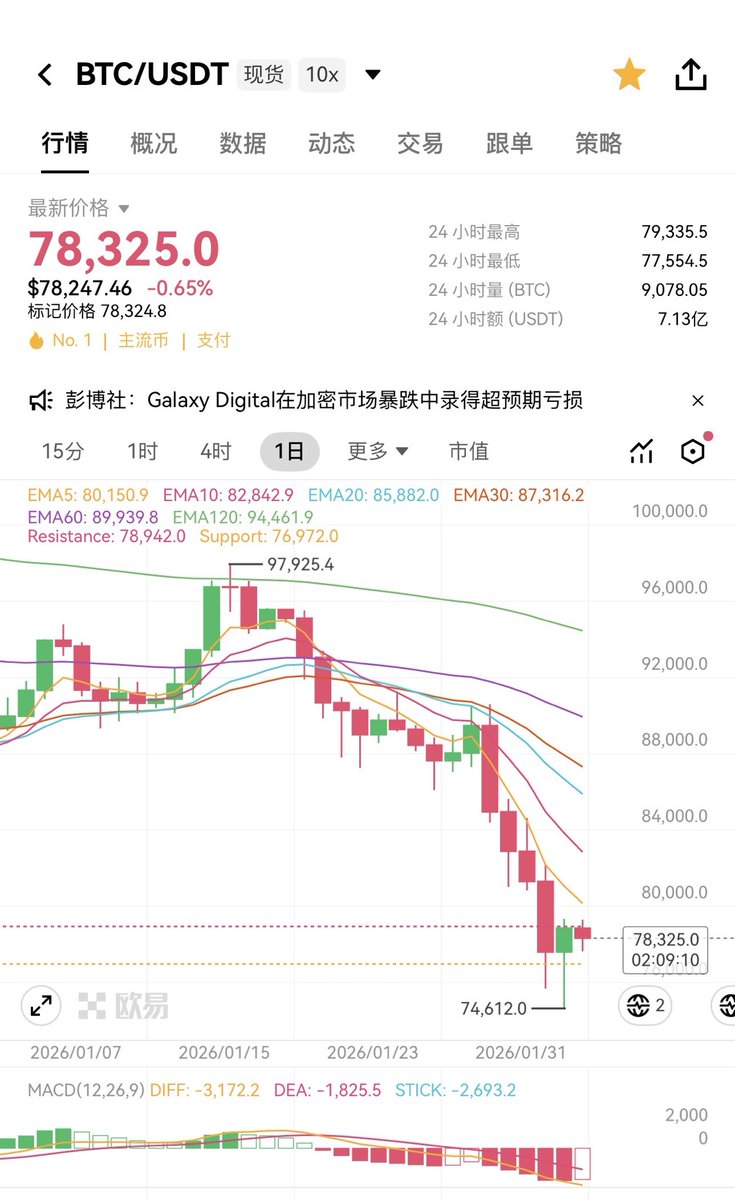 75000-80000之间正常应该要单独磨一段时间才能出结果了,这次跌这么狠,黄金都率先反弹了,BTC也该动一动了吧!