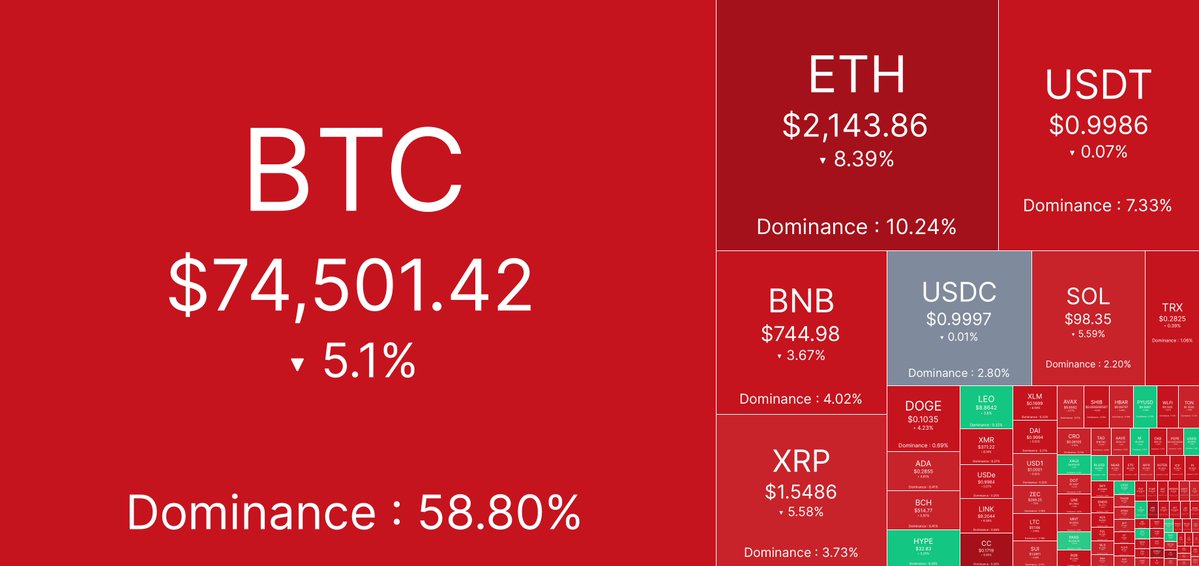This week, Bitcoin dropped below $75,000 while Ethereum nearly touched $2,100.
