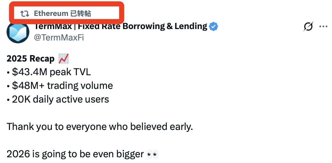 之前写过 @TermMaxFi ,以太坊官推转发了,热度又起来了