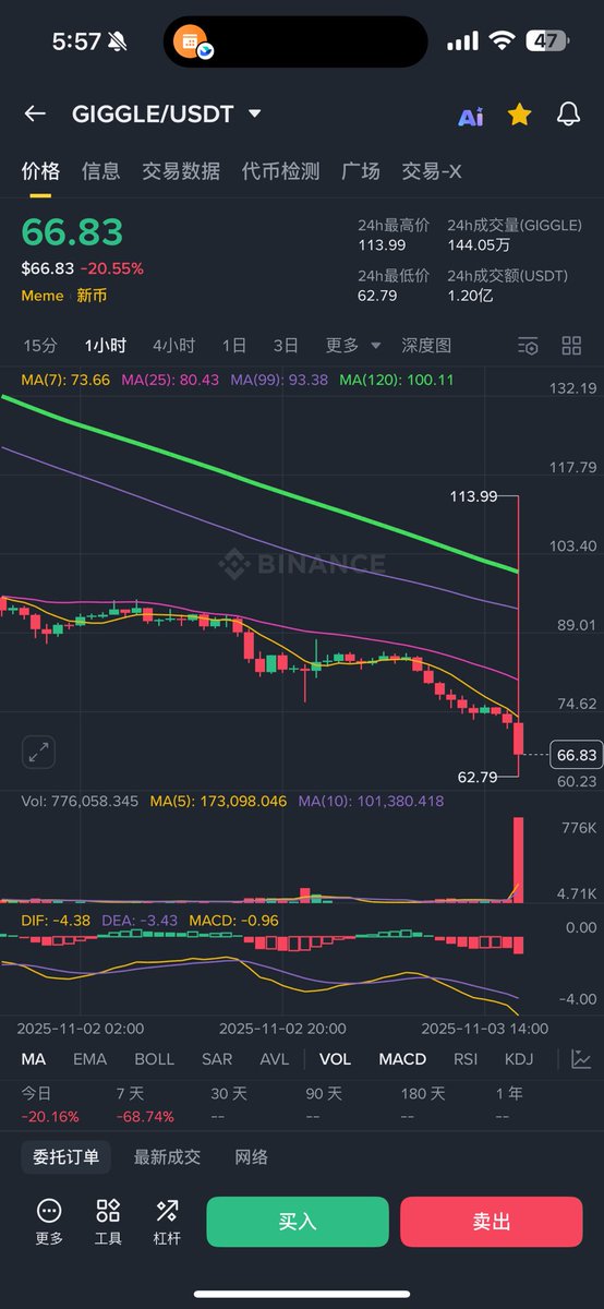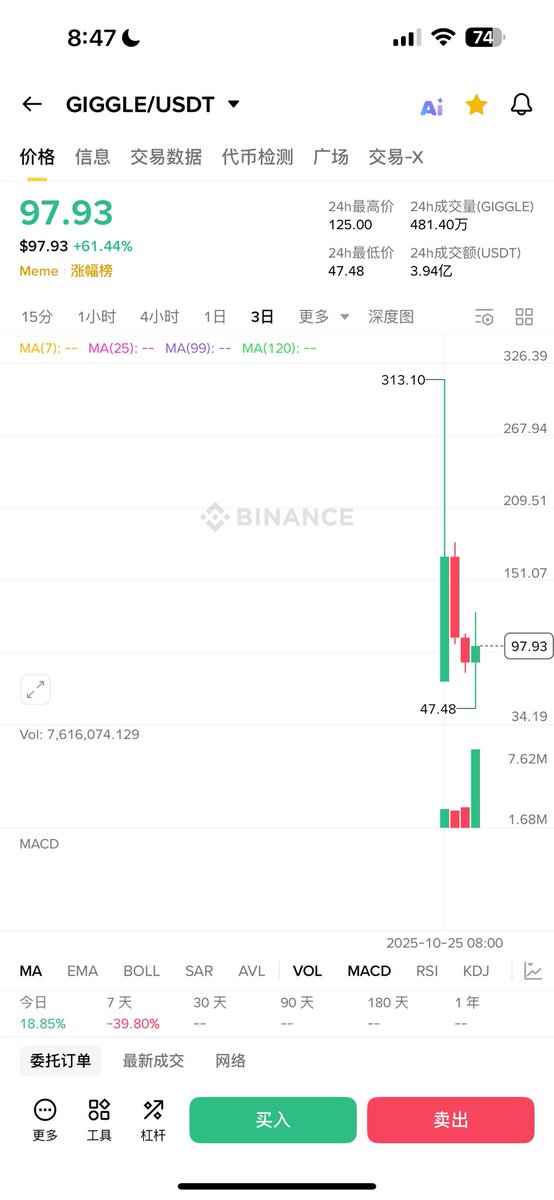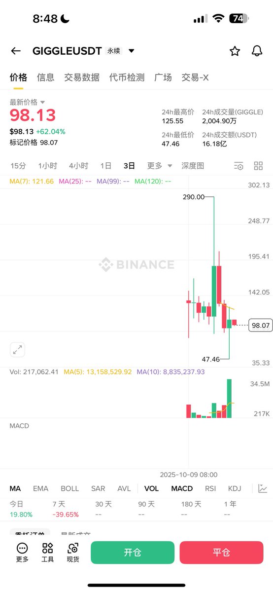 昨晚陪老师掼蛋,发现 $GIGGLE 一根针拉到125,虽然跌到51的时候我看到了,但我那会不敢买,直到惯完蛋看看 $GIGGLE的手续费通缩及捐赠慈善方案的公告,那会78刀,剩下的所有仓位梭哈进去,合约也开了个底倍多