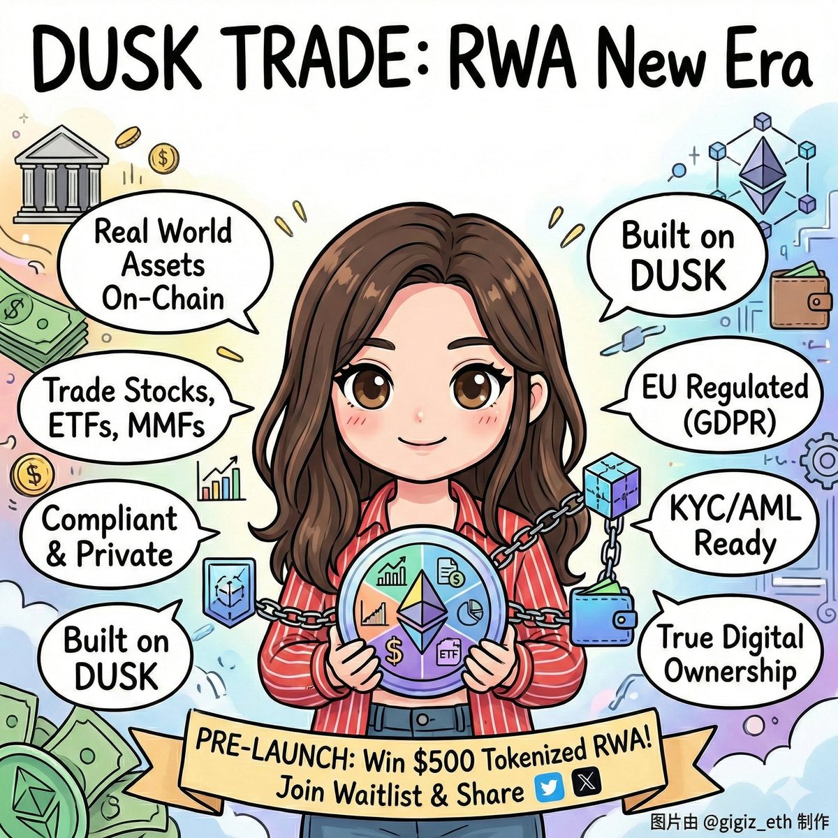 目前项目处于 PRE-LAUNCH 阶段,为了回馈早期参与者,加入候补名单并参与社交媒体分享(比如在 X 上带标签发布推文),用户将有机会赢得价值高达 500 美元 的代币化 RWA 资产 #Dusk @duskfoundation @scottchafin