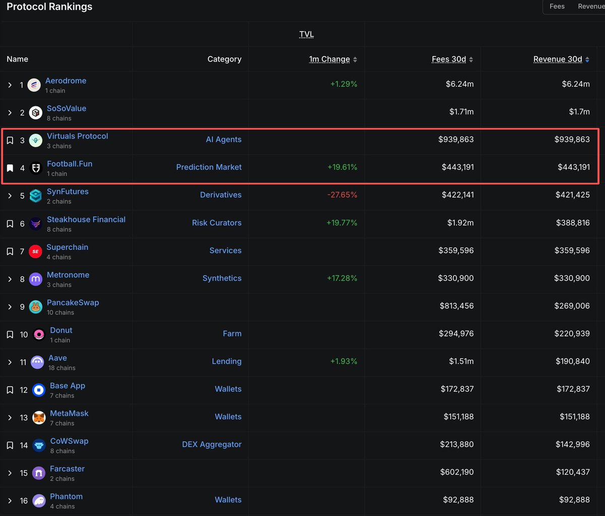 1⃣ @footballdotfun 在 Base 收入榜已冲到 第4,下一个要追的就是 virtual 🧐(图1)