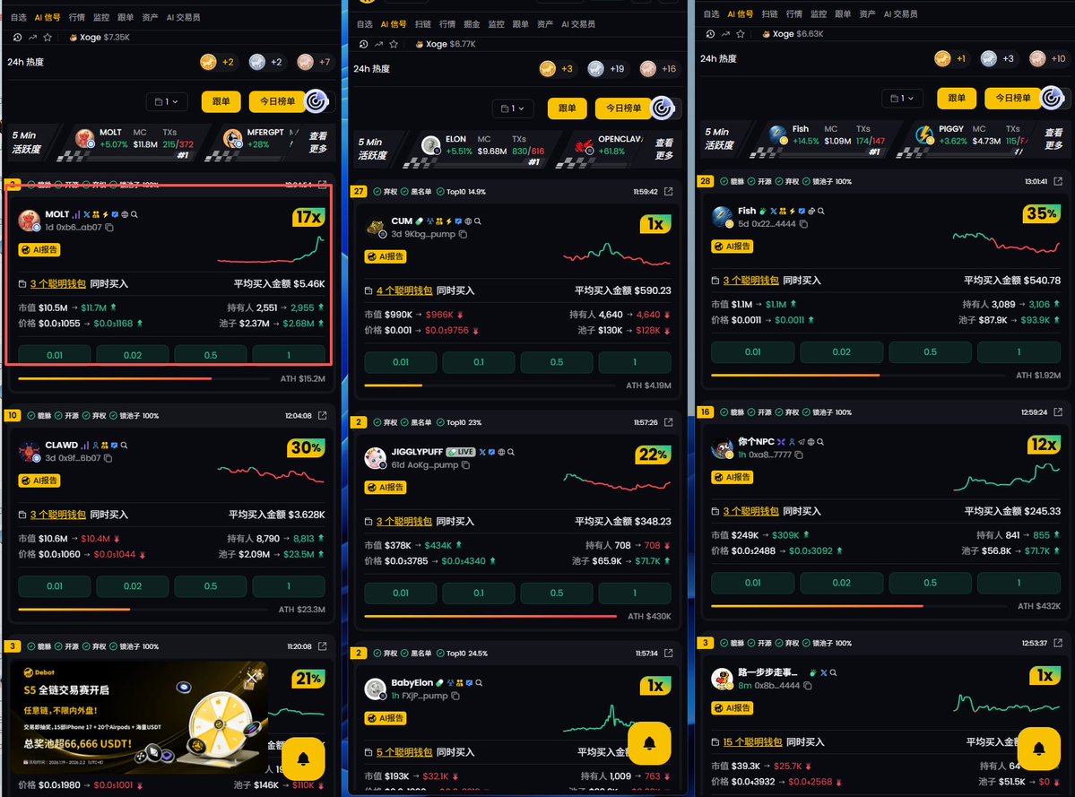 debot这个AI信号功能,我是最近才开始用,体验下来,效果非常不错,市场的大金启动的时候是不会漏的。 相当于帮助自己已经筛选了一遍链上(非常省精力),然后自己再结合经验,和其他数据,去判断是否介入。