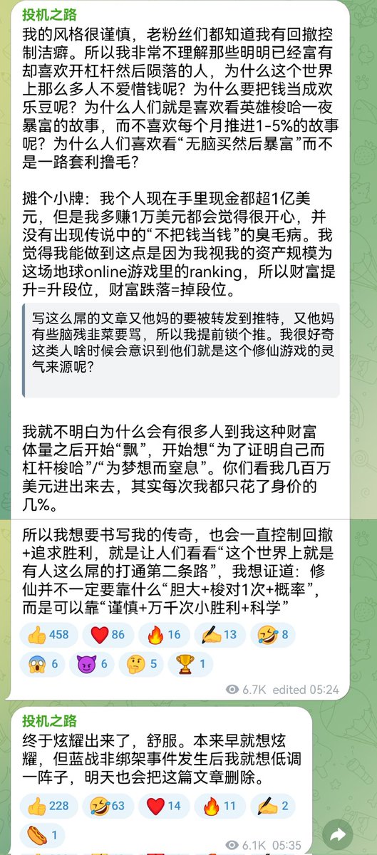 你们是不是也这样、曾经通过格局成功过、赚到一个币过m以上,就会很多币赚到七八万u的时候、觉得不够、很容易陷入幻想,然后被市场情绪、突然的重大利好 想着会有更好的后续,被自我fomo 不卖。 想着 再重演下历史。
