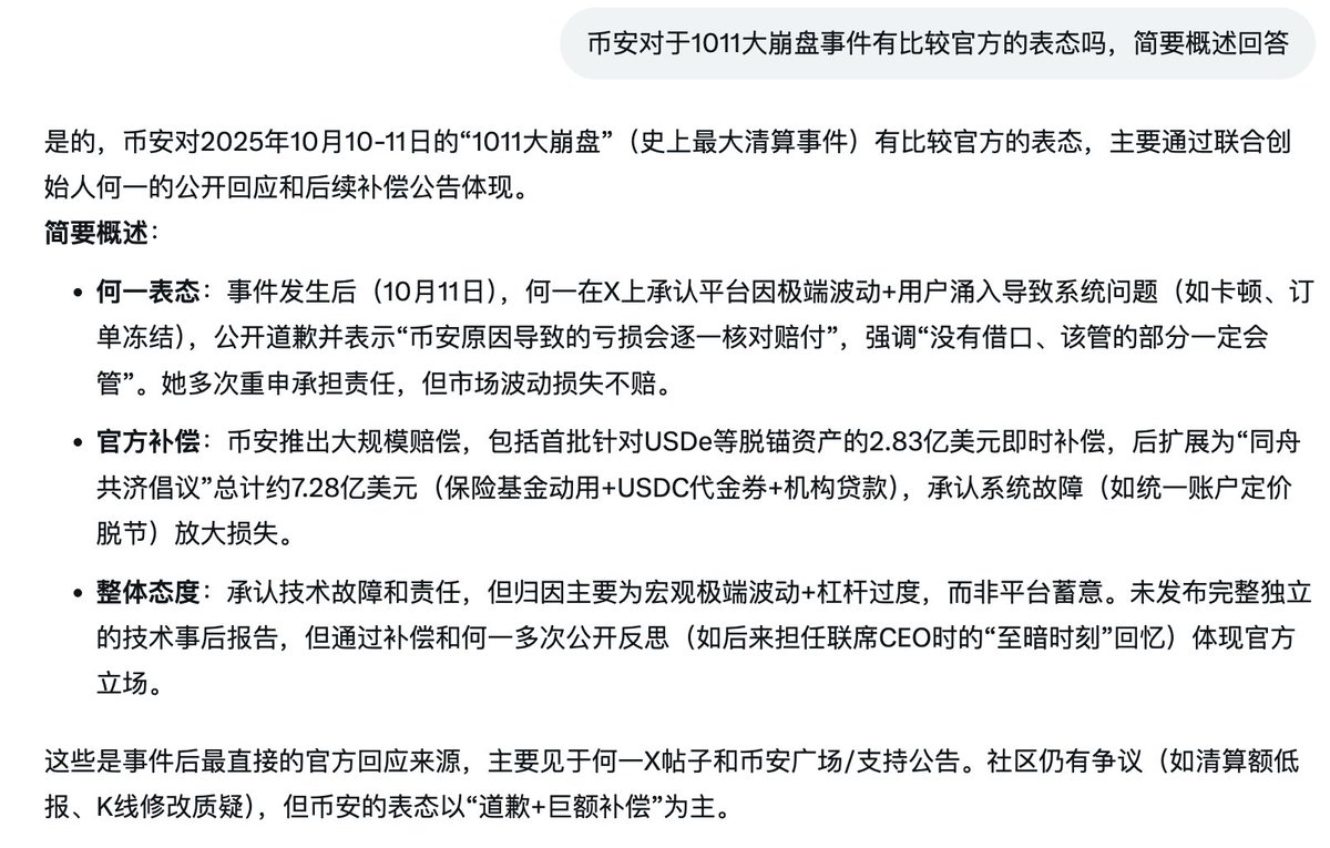 首先实事求是币安在1011事件中确实存在过错需要承担责任,如Grok总结回复,何一 @heyibinance 也公开表态承认币安系统确实出现了卡顿无法下单和USDe脱锚的问题,并进行了一定赔付,但社区主要争议在于赔付金额不够。