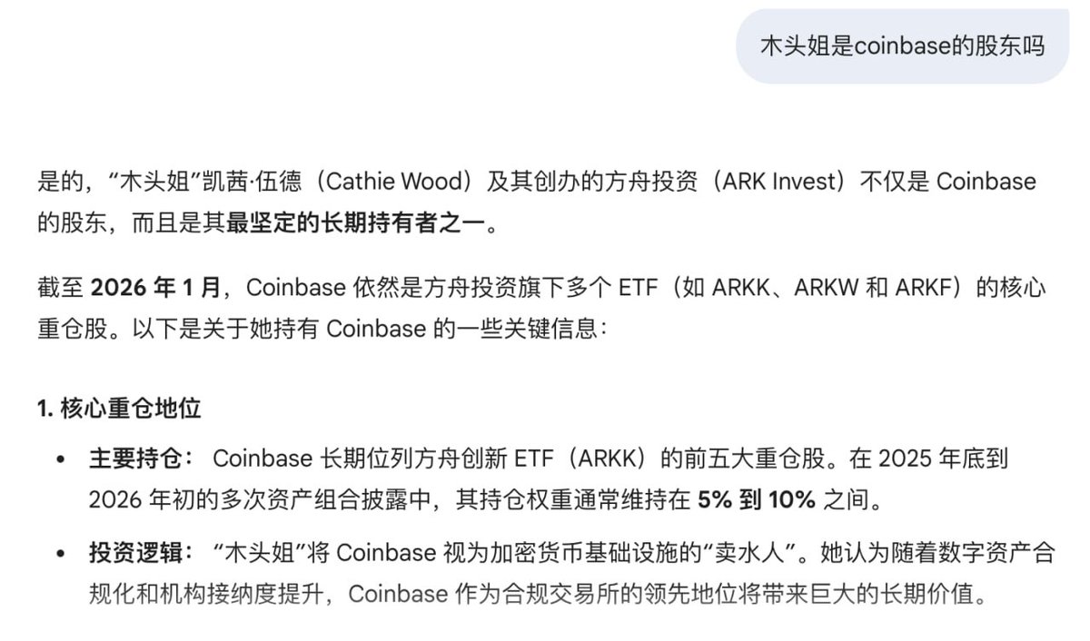 首先木头姐是Coinbase的重仓股东,长期位列其前5大持仓,所以仓位在这里摆着,这不是阴谋论,而是人之常情,就像E卫兵没事就骂Solana两句赌场诈骗链一样,木头姐也经常公开骂币安捧Coinbase。