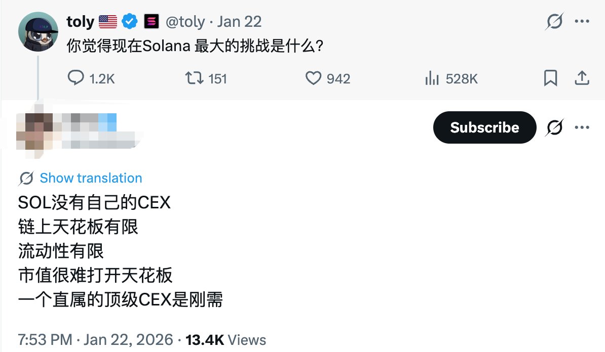 而Solana的创始人Toly也恰好就在2天前用中文发布“你觉得Solana最大的挑战是什么?”,而“没有自己的CEX”则成为了共识最多的回复。