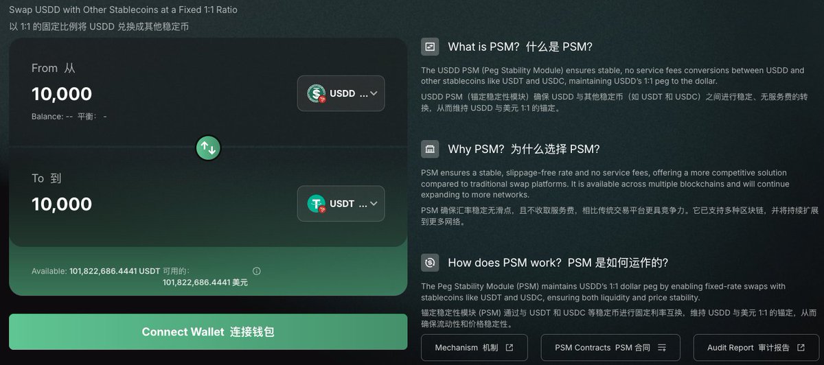 PSM最早由DAI的MakerDAO发明,但孙宇晨将其引入USDD后发扬光大,通过固定汇率而非池子的方式实现USDT和USDD完全1:1兑换,达到无汇率差、无手续费、无滑点的的无磨损效果,再结合Smart Allocator把资金自动在链上路由分配获得收益后,用户不需要考虑为了吃利息而承担两次兑换带来的磨损。